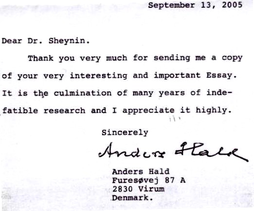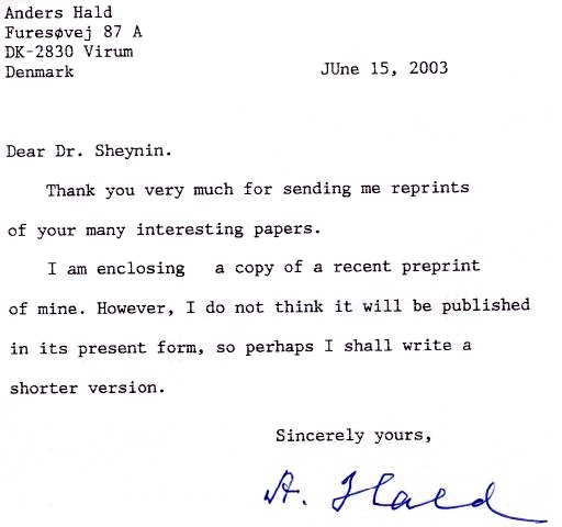 Correspondence between Statistician Anders Hald and Dr. Sheynin, 2003â€2005.
