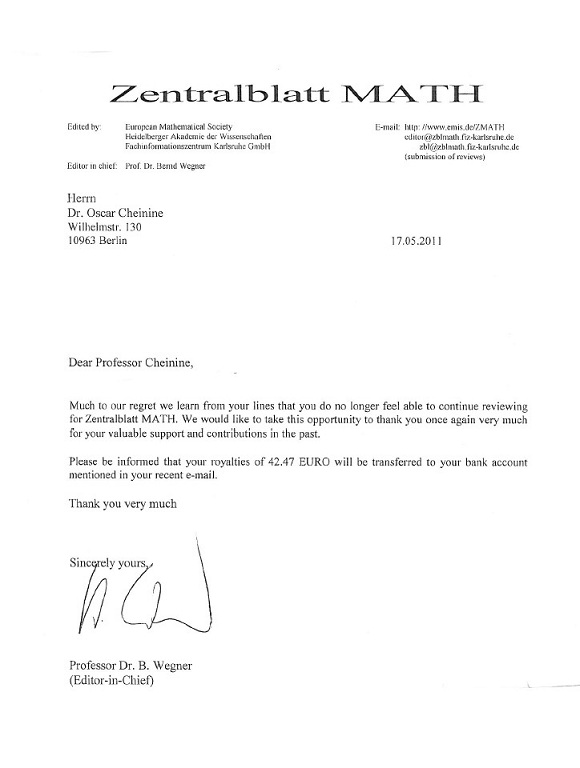 Letter from Zentralblatt MATH Editor-in-Chief, Prof. Dr. B. Wegner, Regretting Professor Oscar Sheynin's Retirement from Reviewing and Confirming Payment of Royalties.